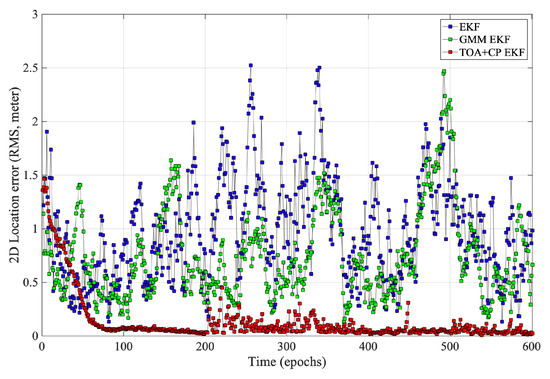 Figure 6 and Figure 7 show the performance of the three algorithms during mobile localization. Since all three algorithms use differential measurements for position solving, it can be seen from the results that the time-varying synchronization errors do not affect the positioning accuracy. At the initial epoch, the accurate integer ambiguity has not been solved, so the carrier phase measurement is difficult to determine the initial position. Therefore, initial positions of all three algorithms are calculated from the Chan algorithm [] using TDOA measurements. It can be seen from Figure 6 and Figure 7 that in the first few epochs, the positioning error of `TOA+CP EKF’ is significant, which is caused by the inaccurate integer ambiguity. In subsequent periods, as the algorithm correctly fix the integer ambiguity, the positioning error gradually decreases. Furthermore, the carrier phase measurement is not limited by the system sampling rate, which, combined with the correct integer ambiguity, makes the carrier phase algorithm suitable for scenarios with high accuracy requirements. Comparatively, both `GMM EKF’ and `EKF’ use only TDOA for user position tracking, which leads to lower positioning accuracy.