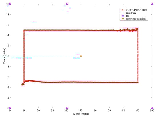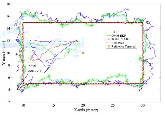 We evaluate the performance of the `TOA+CP EKF’ based differential positioning method as in Figure 6. In addition, we also list two other cases for comparison, wherein `GMM EKF’ [] is a method to perform positioning solution by TDOA measurement, which eliminates the NLOS error by model NLOS propagation as Gaussian mixture model; `EKF’ [] represents a commonly used EKF location algorithm based on TDOA measurement. To eliminate the effect of clock errors, all three algorithms mentioned above use TDOA obtained from Equation (25) instead of TOA for positioning, and the algorithm proposed in this paper also requires SD carrier phase measurements.