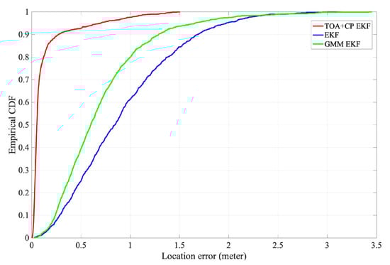 The CDFs for the localization error from both methods are shown in Figure 8. The `TOA+CP EKF’ method has the best performance, with of the horizontal positioning errors within 0.27 m. Therefore, the carrier phase-based localization technique can meet the high accuracy localization requirements. The `GMM EKF’ method has the middle performance due to the algorithm using TDOA for user location tracking and NLOS elimination. Since the system sampling rate limits the TDOA measurement resolution, the positioning accuracy is low. `EKF’ method has the worst performance because it only uses the TDOA and has limited effectiveness in eliminating NLOS error.