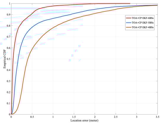 When five BSs are used in the experiment, the BS located at is removed. When four BSs are involved in localization, the two BSs located at are removed. From Figure 10, it can be seen that the localization accuracy of the algorithm proposed in this paper decreases as the number of BSs decreases. The decrease in the number of available BSs leads to a more extended solution period for the integer ambiguity and thus decreases the localization accuracy. In addition, compared with Figure 8, the decrease in LOS probability does not cause severe degradation of the localization accuracy, so the NLOS error suppression scheme proposed in this paper is effective.