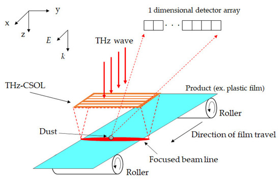 The applications of terahertz (THz) and millimeter waves, including automotive radars and telecommunications, are expanding [1,2,3,4,5,6,7,8,9,10,11,12,13,14,15,16,17,18,19,20,21,22,23,24,25,26,27,28,29,30,31,32]. The THz frequency region is especially receiving attention in anticipation of the 6G technology. THz and millimeter waves are also expected to be highly effective for industrial product inspections. For instance, THz detection of submillimeter metal impurities embedded in a pressboard has been reported using THz time-domain spectroscopy [33]. Metal inclusions in opaque materials can usually be detected using X-rays; however, the use of ionizing radiation is not attractive for product inspection during the manufacturing process. Moreover, it will be highly expensive to upscale x-ray scanners for products with large areas, such as films, which take a longer time to measure. General inspection techniques with visible light utilize line cameras, cylindrical lenses, and one-dimensional scanning systems to reduce the inspection time by subjecting the product to a scanning motion. In contrast to visible light, THz waves are transparent to various materials, such as plastics and insulators, and are opaque to metals, which is practical for industrial inspection applications. However, the resolution is compromised due to the diffraction limit of THz waves, which have longer wavelengths than visible light. With THz waves, conventional lenses cannot achieve a resolution beyond the diffraction limit. Various methods have been studied to improve the resolution of measurements that employ THz waves. Many of them, such as the scanning near-field optical microscope and the laser THz emission microscope [3,34], take advantage of evanescent waves, severely limiting the working distance. In industrial inspection, it is often necessary to use long working distances (WD). Moreover, a long depth of field (DOF) is preferable so that the displacements perpendicular to the scanning direction can be ignored. Thus, one-dimensional measurements, which are useful in product inspection, require components with high resolution, long WD, and long DOF.