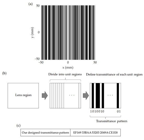 Figure 2a shows the top view of the THz-CSOL design, which is a symmetrical metal mask with slits. The black areas represent the parts with the metal layer (opaque), whereas the white regions represent the slits (transparent). The smallest slit width of our lens is 250 μm (λ/12), which is half the λ/6 width used in a previous study [41]. The smaller the width, the more freedom the design of SOL pattern has, which allows a narrower focal beam width. However, there is a lower limit for the slit width, because if it becomes too thin, the wave will not be able to pass through. Figure 2b depicts how the width and spacing of the slits, which are crucial parameters in the lens design, are derived. The entire lens surface is first divided into 200 unit regions, as shown in the figure. The transmittance of each unit region is then randomly assigned a value of 1 (transparent) or 0 (opaque) until the optimized transmittance pattern is achieved. The opaque condition is specified by setting the thickness of the metal layer above the skin depth to block the THz transmission completely. When fabricating SOLs, the pattern can be fabricated with a thin layer of metal, for example, gold, which has a skin depth of about 230 nm and can be deposited by sputtering process and photolithography or electron beam lithography [42]. Figure 2c shows the hexadecimal representation of the transmittance pattern from the center position toward the edge of the lens.