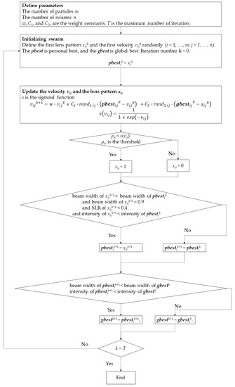 In addition to the desired focal length of z = 70 mm, the THz-CSOL was also optimized to satisfy the conditions at z = 68, 69, 71, and 72 mm. The optimization algorithm used was binary particle swarm optimization (BPSO) [45]. The algorithm flowchart is shown in Figure 3.