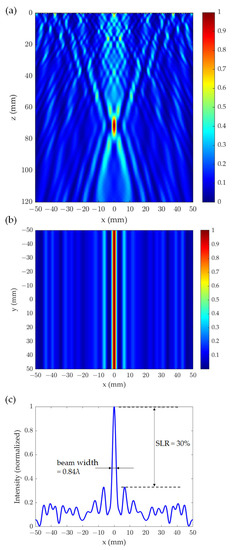 The beam characteristics and intensity profiles of the THz wave transmitted by the numerically designed and optimized CSOL are presented in Figure 4, where the z-axis is the propagation direction and xy plane is the focal plane. Figure 4a,b show the intensity distribution after the THz wave passes through the lens, normalized by the maximum intensity of main peak at z = 71.2 mm. Figure 4a shows the normalized intensity pattern of the focused THz beam on the xz plane and a hotspot is observed from z = 67.7 mm to z = 76.6 mm with a maximum intensity at 71.2 mm. On the other hand, Figure 4b shows the intensity pattern on the xy plane. The focal spot of the transmitted THz beam exhibits a constant maximum intensity along the y direction, which is perpendicular to the polarization. We considered an incident beam that is 100% polarized in one direction. Terahertz waves polarized along the direction parallel to the length of the slits are reflected, while terahertz waves that are polarized along the widths of the slits are transmitted. Side lobes are seen at around x = ±6.1 mm from the central focal beam line at x = 0. The intensity profile at y = 0 mm and z = 70 mm, which is the target focal length for the designed CSOL, is shown as a function of x in Figure 4c. It can be observed in this figure that the beam width is 0.84λ and the SLR is about 30%. We note that the ratio of the THz power transmitted through the CSOL to the total power of the incident THz beam is 25.5%. This implies a relatively low transmittance, especially in comparison to conventional lenses. Improving the power of the focused beam line is one of the future challenges of designing the CSOL.
