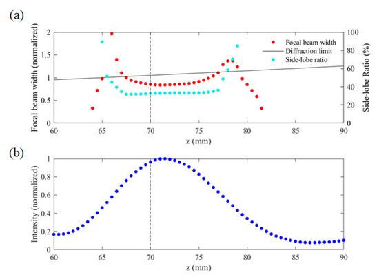 Figure 5b shows the intensity profile along the z direction. With maximum at z = 71.2 mm, the intensity is at least 68.4% from z = 67.7 mm to 76.6 mm, when the focal beam width is smaller than the diffraction limit.
