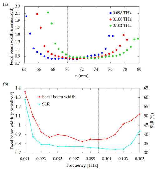 The influence of the size of the incident beam on the profile and intensity of the transmitted THz beam through the CSOL were also investigated. Figure 6a–c show the incident beam profiles calculated using the 1st order Bessel function J0(s), where s = x/2 was used for the plots in Figure 6a,d, s = x/2.5 was used for those in Figure 6b,e, and s = x/3 was used for those in Figure 6c,f. The intensity patterns at the focal length (z = 70 mm) are presented in Figure 6d–f, which collectively show that the broader the incident beam profile, the smaller the beam width and the SLR. These results also indicate that the outer parts of the lens strongly influence the one-dimensional focusing, which results in thin beam line generation. Typical THz sources, such as the IMPATT diode, the Gunn diode, and the resonant tunneling diode, do not transmit only at a specific frequency, but rather at multiple frequencies [47,48,49]. It is then reasonable to expect that the THz-CSOL performance will vary depending on the THz wave frequencies. Hence, we confirmed the frequency dependence of the lens. Figure 7a shows a comparison of the focused beam widths when the THz-CSOL, which is optimized for 0.1 THz, is used at slightly different frequencies. The results show that the focal length of the lens is shortened by 1 mm when the frequency is 0.098 THz. On the other hand, its focal length becomes 2 mm longer when the frequency is 1.02 THz. In other words, the focal length of the THz-CSOL decreases with lower frequency and increases with higher frequency. This is the opposite of what is expected with glass- or plastic-type conventional lenses, which have shorter focal lengths at higher frequencies due to the frequency dependence of their refractive indices. In the case of the THz-CSOL, as the frequency of incident beam becomes smaller, the wavelength becomes longer relative to the widths of the slits and thus the diffraction effects are stronger. This could be one of the reasons why the focal length is shortened. In Figure 7b, the focal beam widths at z = 70 mm and the corresponding SLR values are shown when the CSOL is used at different frequencies. The farther away from the frequency used for optimization, the wider the width and the weaker the focusing. This graph confirms that both the focal beam width and the SLR are optimized to be small at 0.1 THz. This graph also shows that the SLR stays below 35% in the range between 0.093 THz to 0.103 THz. Moreover, the focal beam width remains around 0.9λ between 0.093 THz to 0.102 THz. Thus, these results show that the frequency range for the ideal performance of the lens is tightly limited within less than 0.01 THz from the optimal 0.1 THz, which is comparable to the frequency bandwidth of commonly used CW THz sources, such as the IMPATT diode. In other words, the THz-CSOL is not optimized for a wide frequency range. However, it is possible to design a SOL that can generate a focal beam for a wide frequency range by optimizing it at multiple frequencies.