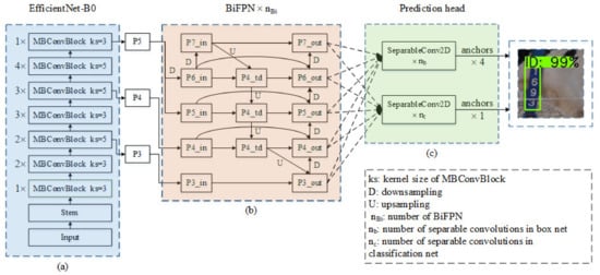 Figure 2b. BiFPN mainly includes two parts: the first is feature upsampling and feature weighted fusion; the second is feature downsampling and feature-weighted fusion. After downsampling and adjusting the number of channels, the feature maps extracted by EfficientNet are used as the input to BiFPN. First, upsampling and stacking of input features are performed, and then downsampling and stacking are performed. In the next BiFPN, the feature layers of the previous stage are used as the input, and up and downsampling and feature fusion are carried out again. This feature extraction method of upper and lower circulation sampling and weighted fusion retains the spatial information of the ID tag and obtains semantic information. From EfficientDet-D0 to EfficientDet-D7, BiFPN has an increasing number of cycles, which means that the depth of the network increases and the extracted feature information is richer. However, with the deepening of the network, the speed of training and reasoning is reduced.