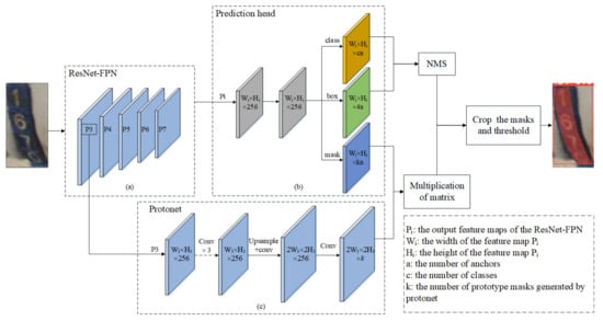 Figure 3b. Then, non-maximum suppression (NMS) is carried out according to the predicted bounding box and the corresponding category confidence. The linear combinations of prototype masks and corresponding mask coefficients are the results of instance segmentation. These operations can be efficiently implemented using a single matrix multiplication and sigmoid:
