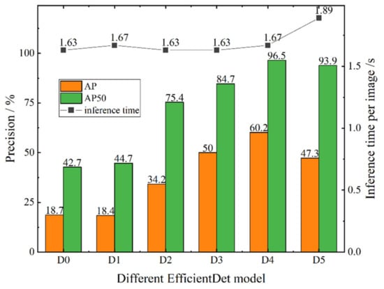 4. According to the statistics of the tag size in the scaled image, the anchor sizes were determined to be 4, 8, 16, 32, and 64. The K-means clustering algorithm was used to calculate the anchor ratios suitable for our dataset, which were (0.7, 1.4), (1.0, 1.0), and (1.4, 0.7). The same training environment and training parameters were used to train Efficient-D0–D5 based on the pretraining model. After training, the performance of different EfficientDet models was evaluated with test sets.