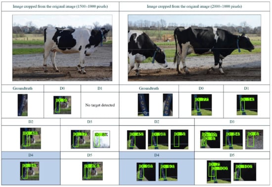 The flexible collar ID tag detection task is required to solve the following two key problems: First, in a side-looking image of a cow walking, the cow is in a continuous state of activity, so the tag is rotated and distorted in different planes, causing different degrees of deformation. Second, when the cow is far from the image acquisition equipment, the pixel area of the tag is relatively small, which causes difficulty in accurate detection. Therefore, we constructed a cascaded model for instance segmentation of the targets. First, the EfficientDet-D4 [