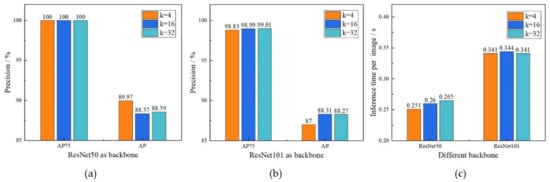 4. ResNet50 and ResNet101 were selected as the backbone of YOLACT++ for training to compare the effects of different backbones on the accuracy and speed of the ID tag segmentation model. To study the influence of the generated prototype masks number