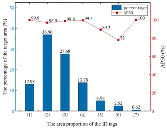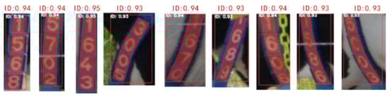 From the statistics of the test results, for the first step of the ID tag detection task, only when the IoU of the prediction and groundtruth bounding box was greater than 0.5 could the prediction box contain all the numbers on a tag. Therefore, the APIoU = 0.50 (AP50) and AP of the detected bounding boxes were selected as the evaluation indices of the accuracy of the tag detection model. For the second step of the ID tag segmentation task, only when the IoU of the prediction and groundtruth mask was greater than 0.75 could the prediction mask contain all the numbers on a tag without background. Therefore, the APIoU = 0.75 (AP75) and AP of the segmented masks were selected as the evaluation indices of the accuracy of the tag segmentation model. For the proposed cascaded instance segmentation method, we multiplied the AP50 of the detection model and the AP75 of the segmentation model to obtain the final accuracy of the ID tag detection model.