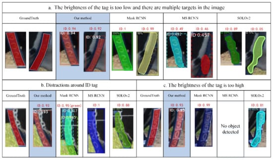 33] were used to segment ID tags, and the accuracy and speed of our proposed method and the above methods were compared. (5) The robustness of the cascaded instance segmentation model to changes in area, ID tag deformation, and brightness was analyzed.