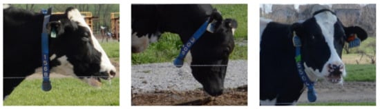 Figure 1b. Each collar contained four square blue plastic blocks with white numbers; the four-digit numbers were the only identity labels of the cows.