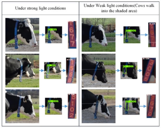 An individual dairy cow identification model that functions through the detection and recognition of the ID number on their collar tag requires simple description features and a small network scale compared to biometric identification. The tagging and maintenance processes of this method impose a lower workload than RFID and do not affect the welfare of the dairy cows compared. Specifically, the ID tag worn on the cow’s neck is first located, and then the ID numbers on the tag are recognized to identify the dairy cow. Zhang et al. [