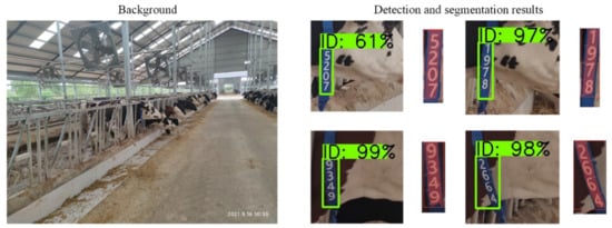 To verify the background robustness of the cascaded model, we collected images of dairy cows wearing collar ID tags in the feeding bank at Sheng Sheng Farm, in Luoyang, Henan province, China. The images were captured from 9:30 to 11:30 under natural light on 16 September 2021. A cellphone (Xiaomi 10, Xiaomi Inc., Beijing, China) was used for hand-held shooting. The camera was set to autofocus and autoexposure mode. Images were captured from different angles when dairy cows were fixed on fences. A total of 200 images were captured, where 20 cows were involved and four different collar IDs were used. The resolution of the images was 5792 (horizontal) × 4344 (vertical) pixels.