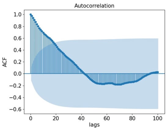 Figure 1 shows the ACF of randomly selected traffic speed time series data, and the interval between each time point is 5 min. The confidence interval is set to 95%, which is the blue shaded area. It is obvious that the current time is highly autocorrelated with the first-order lag time, and the ACF value before lag time 19 is above the confidence interval; that is, there is autocorrelation between the two time points. However, it can also be seen that the ACF gradually decreases with the increase in the number of lags.