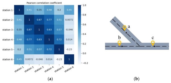 Sections of the road network are interconnected according to a certain topological structure. The traffic flows distributed on different road sections affect each other, which forms the spatial correlation of the traffic flow. This correlation exists not only between the upstream and downstream sections, but also between different roads. Figure 2a shows the Pearson coefficient of traffic speed between six adjacent sensor stations on the same expressway. The figure illustrates that spatial dependence is related to the distance between sections. The smaller the distance, the greater the correlation coefficient, and conversely, the correlation coefficient decreases with an increase in distance. In Figure 2b, section A is not on the same road as sections B and C, and the traffic flows from sections A and B downstream to section C. When the traffic flow of section A increases, it inevitably increases the flow within section C and causes traffic stagnation. The stagnation of section C will also affect the upstream direction in section B and slow the vehicle speed in section B accordingly. Additionally, speed is affected by many other factors, including geographical location, traffic time changes, and the number of lanes open. These external factors also lead to the instability and non-linearity of traffic speed, which makes the task of traffic speed prediction extremely challenging.