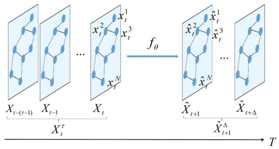 Each vertex obtains the traffic speed data collected by the detector with frequency . represents the speed value collected by vertex v at time t. represents the n-dimensional vector composed of N speed values monitored by n vertices at time t. is the speed value monitored by N nodes from time to time t. , is the predicted speed of N nodes at the time and is the predicted speed of all nodes of step from time , as shown in Figure 3.