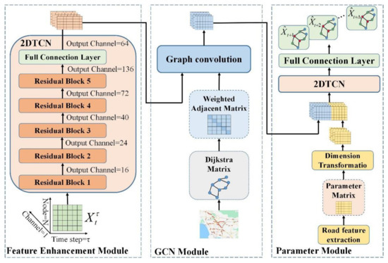 This section explains the SPTMN model framework in detail. As shown in Figure 4, the SPTMN model consists of three parts. The first part is the feature enhancement module. The input data of this module is the time series data obtained by the sensor station. The input channel is 1, i.e., speed and the feature is single. Therefore, 2DTCN expands the feature dimension of the data to 64 through 5-layer residual blocks to realize feature enhancement and preliminary spatio-temporal feature extraction. The second part is the graph convolution module. In this module, the weighted adjacency matrix is obtained by the Dijkstra algorithm according to the coordinates and adjacency relationship of monitoring stations, and then GCN extracts the global spatial dependence of data based on the weighted adjacency matrix. The third part is the parameter module, in which the geographic structure information of these roads is extracted to form the parameter matrix, the parameter matrix is fused with the output of graph convolution, and then the high-dimensional spatio-temporal features and parameter dimensional features are extracted by 2DTCN. Finally, the final prediction results are obtained by FCN. The following is a detailed explanation of these three modules.