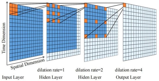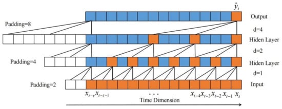 where k is the size of the kernel and d is the dilated rate. is the time dimension direction. The dilated rated increases exponentially with the increase in the number of convolutional layers; that is, the dilated rate of the causal dilated convolution of the i-th layer is , and the receptive field size of each layer is . To ensure that the length of each layer’s input and output sequences were the same, padding was added in the process of the convolution. Generally, the padding strategy was to add 0 and the size was . The structure of the 3-layer causal dilated convolution with the kernel of 3 is shown in Figure 5.