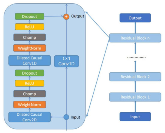 The residual block generally consists of two layers of causal dilated convolution, a weight normalization layer, a clipping layer, an activation function, and a dropout layer. The clipping layer can keep the feature-length constant, the activation function uses the Rectified Linear Unit (ReLU), and the dropout layer prevents the network from overfitting. Finally, 1 × 1 convolution changes the dimensions of the input data to be consistent with the output data. TCN usually consists of multiple stacked residual blocks. The TCN residual block structure is shown in Figure 6.