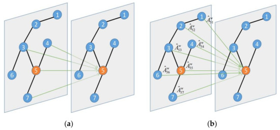 As shown in Figure 8a, the essence of GCN is actually a linear combination of neighbor features and its own individual node features. A multi-level GCN will lead to an over-smoothing problem [37], which makes node discrimination consistently worse, until finally, the node features tend to become similar. Therefore, GCN architectures are very shallow at present. The road network structure is complex and the receptive field of shallow GCN is limited, so it is difficult to fully extract the spatial correlation between nodes. Consequently, when constructing the adjacency matrix, a weighted adjacency matrix was used in this study. We used Dijkstra’s shortest path algorithm to calculate the distance between node and node . The weighted adjacency matrix is defined as: