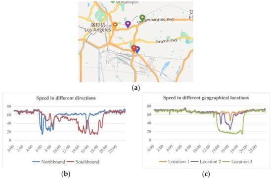 The geographical location, structure, grade, and direction of the road also affect the speed. As shown in Figure 9a, two sensor stations in Highway 5 and three sensor stations in Highway 10 are selected in the American PeMS system to extract their vehicle speed data for comparison. The red and blue sensor stations in Highway 5 are geographically close, but the red station is located in the southbound lane and the blue station is located in the northbound lane. Figure 9b shows the comparison of the speed changes at these two stations. Going north on the road leads to Los Angeles and, therefore, the northbound lane is seriously congested and slow moving during the morning peak hours, whereas the southbound lane is slow moving during evening peak hours. The speed change trend is related to the lane direction. The yellow, purple, and green stations are located at different locations in the same lane of Highway 10. The speed comparison results are shown in Figure 9c. The duration of the evening peak and the degree of congestion vary significantly with the location. Comparing Figure 9b,c, it can also be seen that the overall change trend of speed on different roads is different.