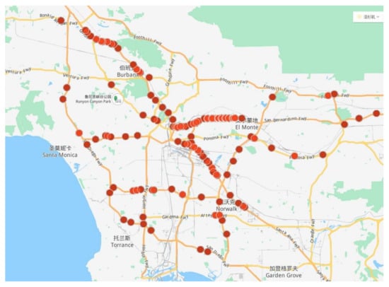 The dataset used in the experiment was selected from the U.S. highway dataset PeMS. This dataset is open for download. The speed data is the average speed of the road section obtained by the sensors. It contained the data of 157 sensor stations; the locations of which are shown in Figure 10. The dataset was sampled at 5 min time intervals, and 288 slices were obtained daily for each node, with a total of 9216 slices obtained over 32 days between 1 November 2020 and 2 December 2020. The dataset was normalized by zero-mean, and 80% of the dataset was set as the training set and 20% as the verification set. In the training set, a time series sliding window with a step size of 1 was adopted to carry out overlapping sampling to create a rolling prediction of traffic speed [38]. As shown in Figure 11, the window size was 12, that is, the speed of the first 12 time slices was used to predict the speed of the next three time slices, namely, the traffic speed at 5, 10, and 15 min.