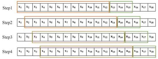 Time series data sliding window with overlapping sampling. The first step is to extract the speed data at 1–12 time points to predict the speed at 13–15 time points, the second step is to extract the speed data at 2–13 time points to predict the speed at 14–16 time points, and so on to realize rolling prediction.