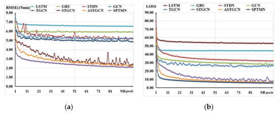 Figure 12a shows the change in RMSE in the 15 min prediction results with the training rounds. The RMSE of some models fluctuates with varying degrees during the decline, which indicates that some outliers will appear during the prediction process, resulting in a sudden increase in RMSE values. Although the RMSE of SPTMN has the fastest and most stable descent, Figure 12b shows the changes in the average loss value over three time steps with the epochs. The loss value of our proposed model decreases rapidly in the first five epochs and drops below 10 during the 10th epoch. After the 20th epoch, the decrease becomes slow, indicating that the model has converged. The above two points fully illustrate the stability and efficiency of the SPTMN model.