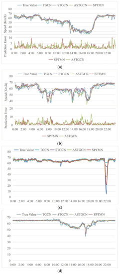 In Figure 13a,b, the upper part shows the comparison between the real data and the predicted data of each model, and the lower part shows the variation in the prediction error of SPTMN and ASTGCN models over time. The monitoring station in Figure 13a had some speed changes, but the trend is relatively flat. The prediction curve of SPTMN fits the ground truth the best. The large error is mainly concentrated in sudden changes of speed. For today’s prediction results, the MAE value of SPTMN is 1.91 and of ASTGCN is 2.16. Figure 13b shows the comparison of predicted results of each model at a monitoring station with large and frequent speed fluctuations. The prediction performance of the SPTMN model remains the most accurate. When the speed changes suddenly, SPTMN can respond quickly to the change, and its prediction error is significantly less than that of other baseline models. According to the statistics, the MAE value of SPTMN is 2.03 and of ASTGCN is 2.53. When the speed fluctuation increases, the prediction error of ASTGCN visibly increases, but the prediction error of our proposed model changes only slightly. A unique situation occurs at the monitoring station in Figure 13c, where the speed drops to close to 0 in a short time, which is a challenge for all the models. The prediction results of SPTMN fit the real data best, followed by ASTGCN, STGCN, and TGCN, which responded to this phenomenon, but the predicted speed is very different from the real data. The first three monitoring stations are all located in the Mainline. Figure 13d shows the monitoring station in the HOV lane, which is characterized by small and gradual changes in speed. All models have satisfactory prediction outcomes. At this station, the MAE of ASTGCN is 0.75, and the MAE of SPTMN is the lowest amongst all the models, at only 0.73. Overall, we conclude that our proposed model displays a more accurate and stable prediction performance under varying conditions, and therefore has a wider range of applications.