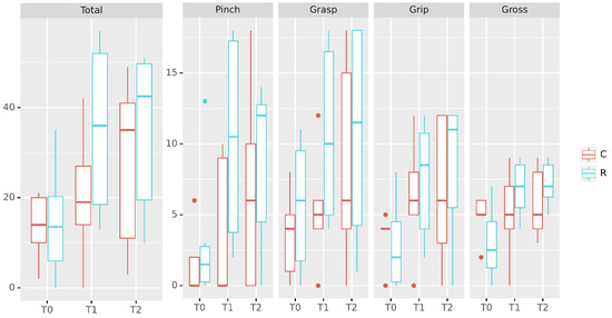 | ARAT Total | T0 | 14 (10:20) | 13.5 (6:20.25) | SW | 0.9513 | 0.6616 |