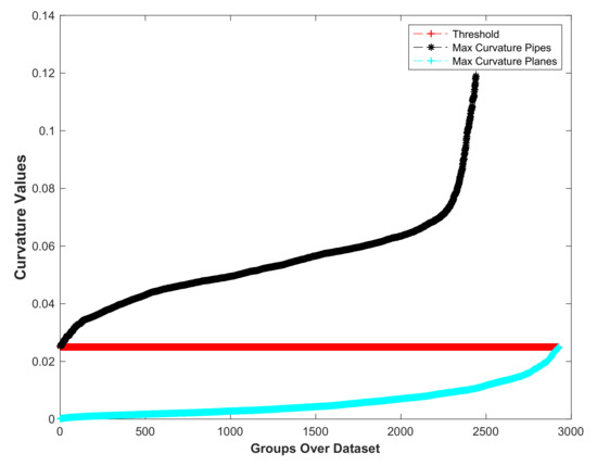 Mean curvature threshold separating the pipes from the flat areas. The horizontal axis represents, for all the dataset scans, the regions obtained using the region-growing method. The vertical axis provides, for each region, its mean curvature.