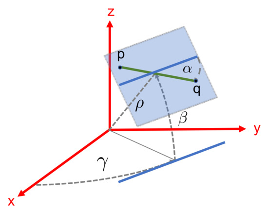 The pipes are represented using an ortho-normal line representation [57] consisting of three angles of rotation () and the shortest distance from the frame origin to the line (2) (Figure 6).