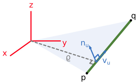 Given the segment endpoints ( and ) provided by the pipe detection algorithm (see Section 3.3), the ortho-normal representation is computed using Plücker coordinates [58].