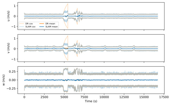 Comparison between dr and SLAM mean values and covariances for robot velocity.