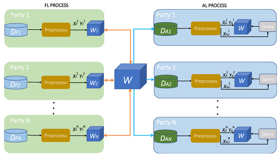 The entire machine learning process is divided into two stages, the FL and the AL stage. We assume N participating entities, where each party holds locally two inputs, the input used for training the attack detection and classification model in federation with the rest of the participants, and the input used for adapting the final global federated model to each of the participants’ traffic. During the FL stage, each party p pre-processes the inputs by applying feature normalization to turn data into values in the range, as demonstrated in (1) [32] where is the scaled feature value, is the feature vector and is the initial feature value;