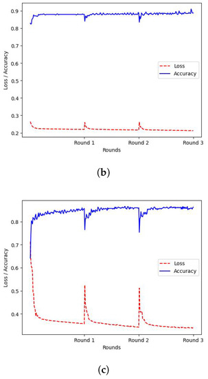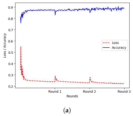 Initially, the FL approach described in Section 3.2 was applied, to train models in r = 3 consecutive federated rounds. Specifically, , or 3 workers were deployed for distributed training, each one holding locally FL datasets containing instances from all 9 classes, however, for each of the workers, the FL dataset was biased towards a specific class by 50%. The training loss and accuracy of the FL procedure for each worker can be observed in Figure 3, where the X-axis represents the federated rounds, while the Y-axis represents the corresponding value of the accuracy or loss.