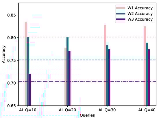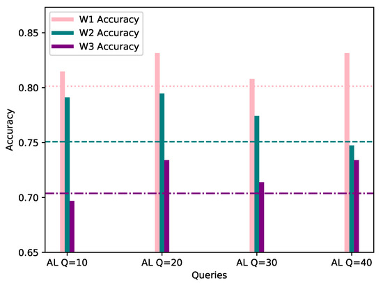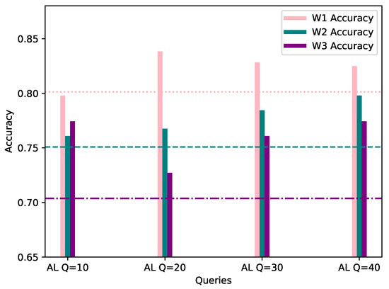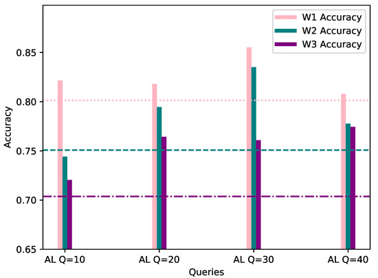 Accuracy of W1, W2 and W3’s models personalized with 20% AL dataset bias (Y-axis) per Query (X-axis), evaluated using their corresponding evaluation datasets. The FL accuracy for each worker is represented by the horizontal line of the worker’s respective color.
