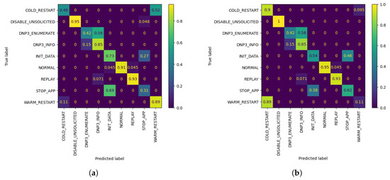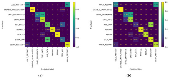 As observed in the underlined results in Table 2 and Figure 4 above, the metrics show an increase when compared to the corresponding FL metrics in Table 1 in the vast majority of cases. It is worth noting that, even in cases where the metrics show a minor decrease, such as W1 AL model’s accuracy with 10 queries, the model is able to classify correctly all of the network flows which belong to W1’s biased class, namely DISABLE UNSOLICITED, whereas the global federated model showed inability to do so. The confusion matrices resulting by W1’s FL and AL evaluation for 10 queries can be observed in Figure 5. In addition, through Figure 4 it is becomes clear that for W1 and W3, 10–20 queries suffice for increasing the accuracy of their local model, while for W2, training can be stopped after 10–20 queries in case of a strict budget, as there is still improvement in accuracy. Specifically, for W3 the improvement is massive compared to W1 and W1, as its accuracy increased by 7.07% in only 10 AL queries.