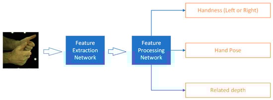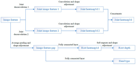 Specific structure with the input and outputs of PoseNet (feature processing network in Figure 1) is displayed. “Image feature” is the feature map obtained in the feature extraction network, “Joint heatmap3d” is the heatmap of the estimated key-points’ position of the hand in a 3D pose, “Root depth” is the root point related depth of two hands, and “Hand type” is the judged hand type (left or right).