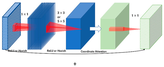 - We redesigned a feature extractor based on deep neural networks to replace the simpler ResNet-50 [14] backbone architecture in the original network and continue to ensure the overall lightweight of the network. We refer to the architecture design of MobileNet v3 [15] and MoGA [16] network and introduce the inverted residual block, Hsigmoid, and Hswish activation functions [15,17]. The latest coordinate attention mechanism [18] is introduced in the bottleneck structure and part of the latest ACON (Activation or Not, can choose the linear or non-linear structure with self-learning) activation function [19];