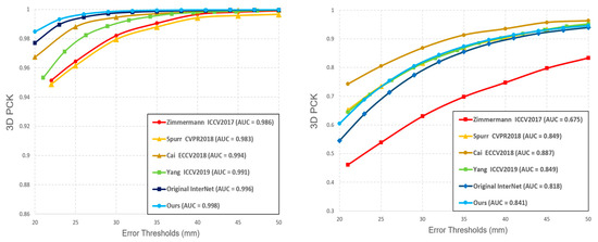 Quantitative evaluation for different methods on STB dataset and RHD dataset. (Left): 3D PCK on STB dataset. (Right): 3D PCK on RHD dataset.