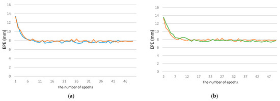 The training method adopts the cosine annealing learning rate method with an initial period of two and a magnification of three. Considering experience, the best result is generally obtained near the epoch where the learning rate is about to converge to 0; hence, the STB result is taken from 45 epochs (if the convergence is fast enough, sometimes the best result will appear at 44 epochs), and the RHD training result is taken from 189 epochs.