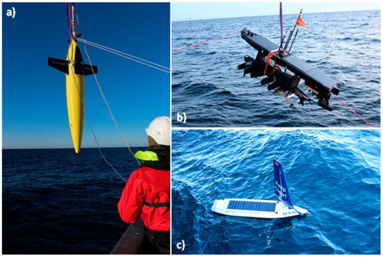Surface and subsurface platforms employed in the GLIDER project: (a) Seaglider® (Huntington Ingalls Industries; formerly Kongsberg Maritime); (b) Wave Glider SV3 (Liquid Robotics); and (c) Sailbuoy (Offshore Sensing).