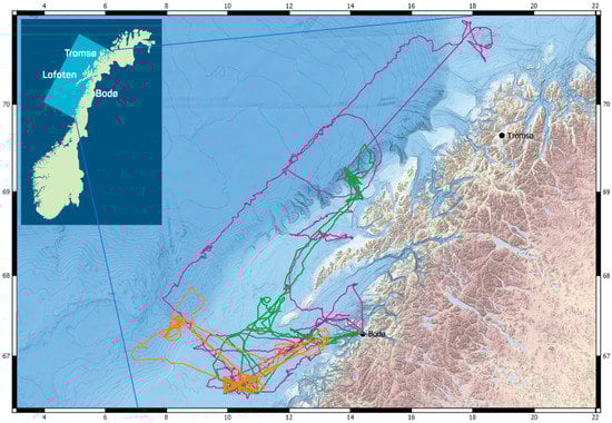 The study site was the shelf-slope-oceanic ecosystem of LoVe (Figure 2). The area is considered rich in biological resources and was characterized as “particularly vulnerable” by the Norwegian authorities [20]. In this area, the phytoplankton spring bloom starts in the fjords by the end of March, progresses to the shelf by April–May, and extends to the basin by May–June. The increased primary production enhances biological activity from the seabed and across the entire water column. The increase in chlorophyll concentration prompts polyp activity in corals [23] and is followed by the ascension to the surface of the overwintering copepod Calanus finmarchicus, the most abundant zooplankton in the region. C. finmarchicus feeds on the phytoplankton production and reproduces during spring and summer [19,39,40]. The marine zooplankton community provides important trophic linking between the microalgae community and higher trophic level species, sustaining major fish stocks, including the highly abundant stocks of cod Gadus morhua (i.e., the Northeast Arctic cod), herring Clupea harengus (i.e., the Norwegian spring spawning herring), and blue whiting Micromesistius poutassou [18,41,42,43]. The LoVe region also provides important spawning grounds and larval areas for the commercial fish stocks of the Barents Sea and adjacent waters, including the Northeast Arctic haddock Melanogrammus aeglefinus stock, the Norwegian spring-spawning herring Clupea harengus stock, and the Northeast Arctic cod Gadus morhua stock [43]. Cetaceans were also reported in the area [11,44], with both humpback whale Megaptera novaeangliae and killer whale Orcinus orca feeding on herring aggregations [44]. The Lofoten Basin is the most eddy-rich region in the Norwegian Sea [45]. Mesoscale eddies transport phytoplankton and key ecosystem species, such as C. finmarchicus and mesopelagic fish, across the shelf. Near the shore, tidal currents play a role in transporting cod eggs northward past the Lofoten Peninsula [46], while the Norwegian Coastal Current (NCC) and the Norwegian Atlantic Current (NwAC) play the main role in transporting eggs into the Barents Sea [19,47]. For example, cod spawned in the LoVe region was found later residing in the Svalbard fjords [48].