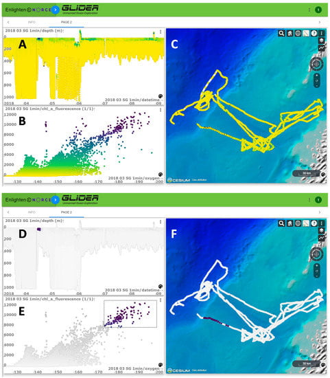 Example plots from the GLIDER web portal showing down-sampled data collected by the Seaglider® in the 2018 survey. In all plots, color on data points corresponds to the level of chlorophyll-a (CHl-a, fluorescence). (A) Depth along the Seaglider® path (x-axis is time, y-axis is depth). (B) Correlation between oxygen (x-axis) and CHl-a (y-axis). (C) Path travelled by Seaglider® for which data are displayed. Bottom panel shows the depth (D) and CHl-a-oxygen correlation (E) along the Seaglider® path (F) after the user applied a filter highlighting high CHl-a and oxygen values.