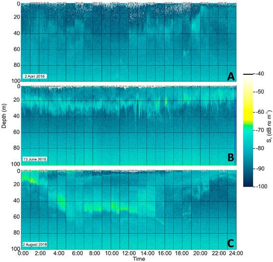 In early spring (April), when copepods ascend from overwintering depths, weak layers of zooplankton were registered from approximately 20–30 m depth. Later in the season (June), a persistent high-density layer of zooplankton was observed in the upper 10–40 m. In late summer (July–August), the zooplankton layers were distributed across a wider depth range, exhibiting diel vertical migration patterns [49]. Stronger individual scatterers were also observed within, below and above the zooplankton layer, likely fish and fish larvae grazing on the zooplankton layer. Net sampling in April and June in adjacent areas revealed that zooplankton composition comprised mainly the copepod Calanus finmarchicus, a dominant zooplankton species in the area [39].