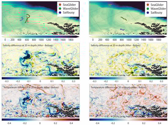 Snapshots (left column: 20 March 2018, right column: 3 April 2018) of glider data assimilation influence on the NorShelf-2.4km model salinity and temperature fields. Upper panel: topography and gliders’ positions, middle panel: salinity difference at 20 m depth, lower panel: temperature difference at 20 m depth [57].